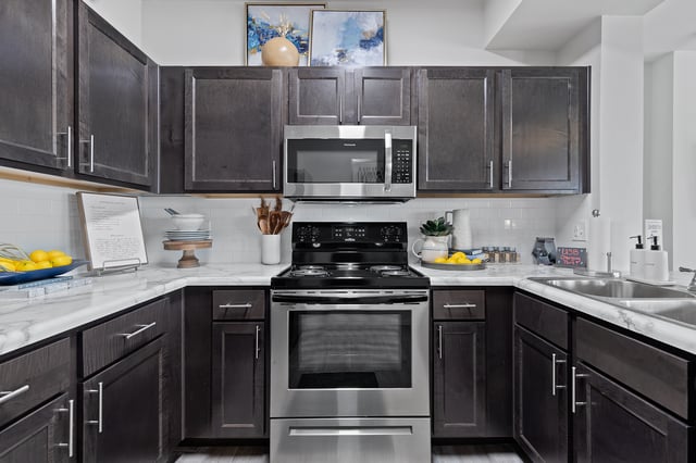 Relax, connect with loved ones, and catch up with friends at our luxury apartment community, featuring posh amenities in each apartment and throughout our inviting community. Our Kansas City luxury apartments feature gorgeous chef’s kitchens adorned with white tile backsplash and dove gray or espresso cabinets.