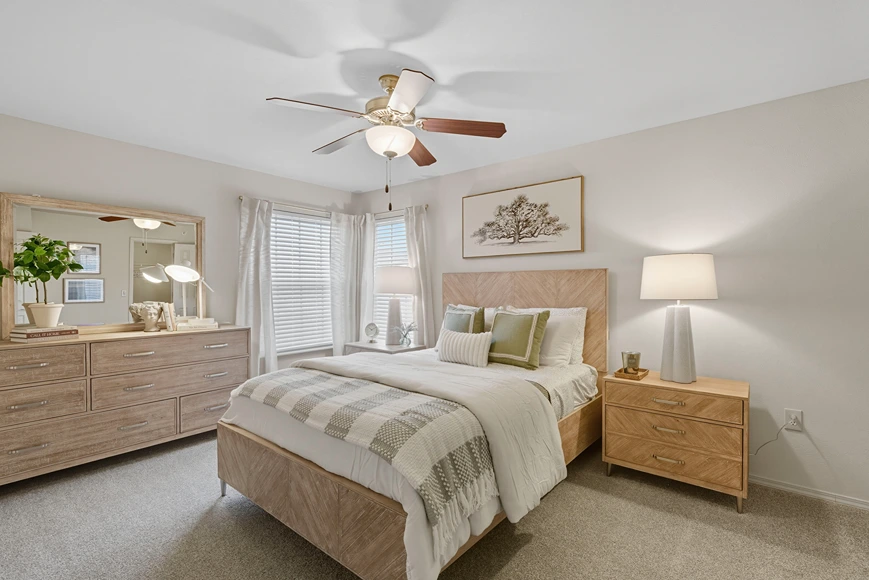Find comfort in our spacious 2 bedroom apartment homes. The master bedroom is nearest the entryway with a sizable closet and a spacious customizable interior for your most comfortable furniture.